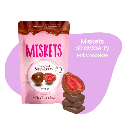 Fruchtig. Cremig. Besonders. Miskets steht für Premium Schoko-Frucht-Dragees, die echte Frucht mit zartem Schokoladenschmelz verbinden. Im Kern steckt gefriergetrocknete Erdbeere, außen eine feine Schokoladenschicht – eine Kombination, die knuspert, schmilzt und voll Aroma ist.