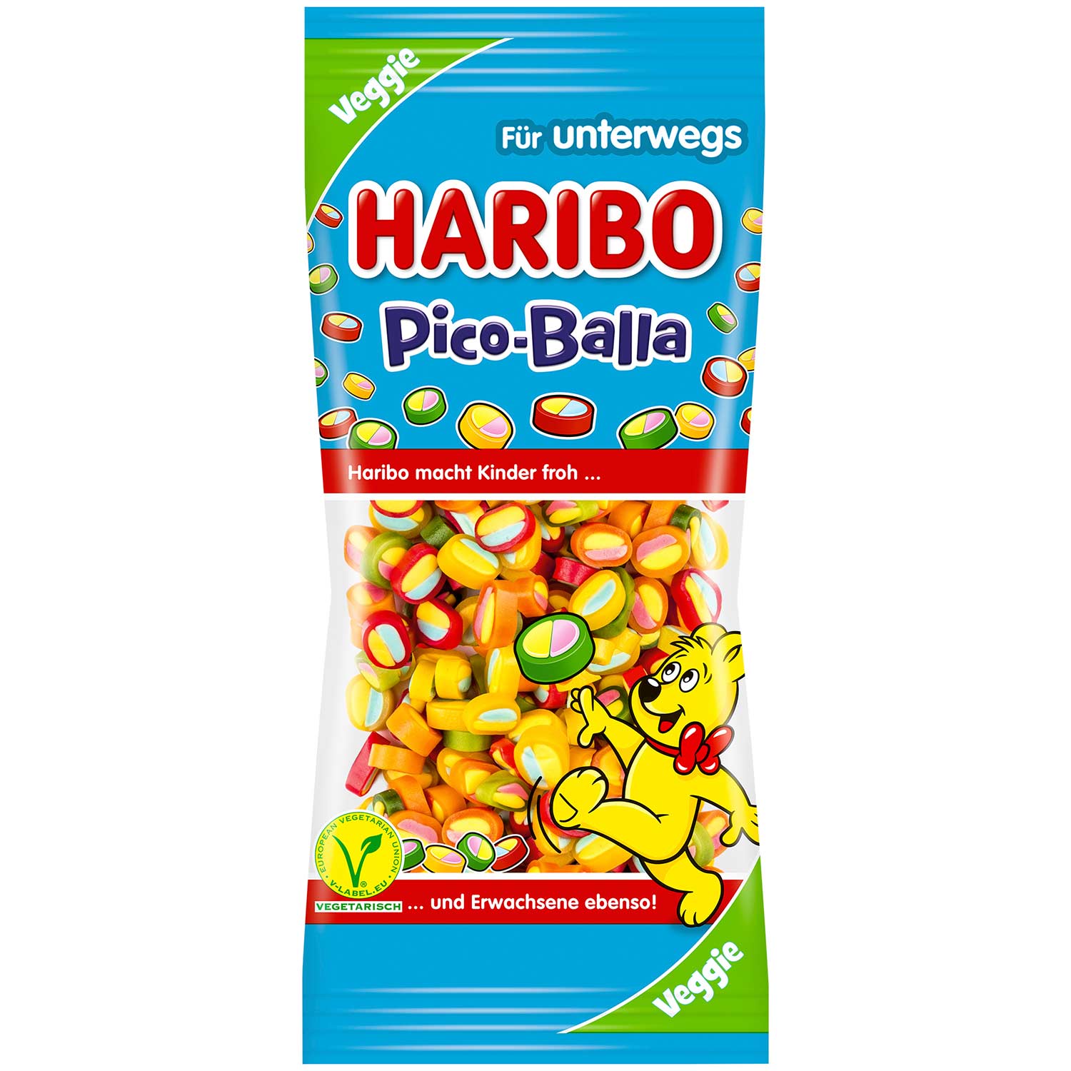 Die kleinen Rundum-Sorglos-Happen in XL! Haribo Pico-Balla kombiniert fruchtige Ringe mit einer weichen Füllung – außen chewy, innen saftig. Viele Farben, viele Geschmacksrichtungen und jede Menge Abwechslung bei jedem Griff in die Tüte. Bunt, soft, veggie, verspielt und einfach verdammt lecker.